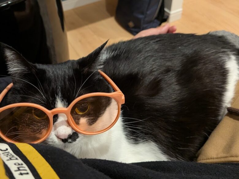 でも意外と嫌がらず、しばらくはメガネを装着してくれてました。